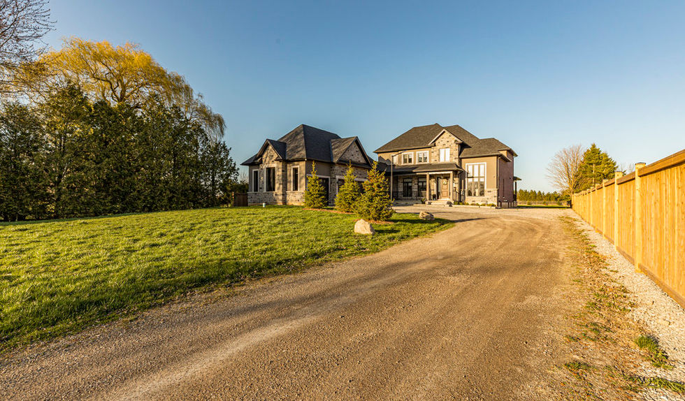 Experience refined country living in this custom-built 2-storey home, privately set 350’ from the road on nearly 2 acres with sweeping pastoral views. A grand foyer with 20’ ceilings and porcelain floors introduces the exceptional quality and craftsmanship found throughout. The dream kitchen features quartz counters and backsplash, high-end appliances including an 8-burner gas range, a cappuccino bar, and a walk-in butler’s pantry—opening to the Great Room with 10’ coffered ceilings, hardwood floors, a gas fireplace, custom lighting, and built-in sound. Entertain effortlessly indoors or out with access to the expansive covered deck. The formal dining room, with 15’ coffered ceilings and oversized windows, offers an elegant space for gatherings. Upstairs, 9’ ceilings enhance the serene primary suite with a spa-inspired ensuite, joined by a second bedroom with private 4-piece bath and two additional bedrooms sharing a 5-piece Jack & Jill. The fully finished lower level extends the living space with a large recreation room (rough-in for kitchen or wet bar), gym, storage, and two additional bedrooms—each with their own bath—ideal for in-law or multi-generational living. Additional highlights include a 4.5-car garage with inside entry to a well-appointed mudroom with built-ins, laundry with side-by-side washer/dryer, and a large walk-in closet. The fenced backyard offers endless potential for your dream oasis—pool, sport court, or gardens. A rare blend of space, sophistication, and versatility—your private country retreat awaits.